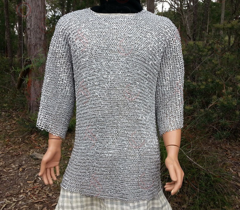 Aluminium chainmail made from 9mm riveted links. Every single link has been hand riveted and unlike other riveted mail this is as durable and lightweight. Aluminum may look very shiny and therefore it is important to have riveted for that authentic look.