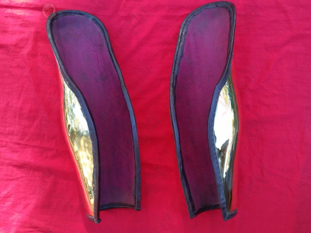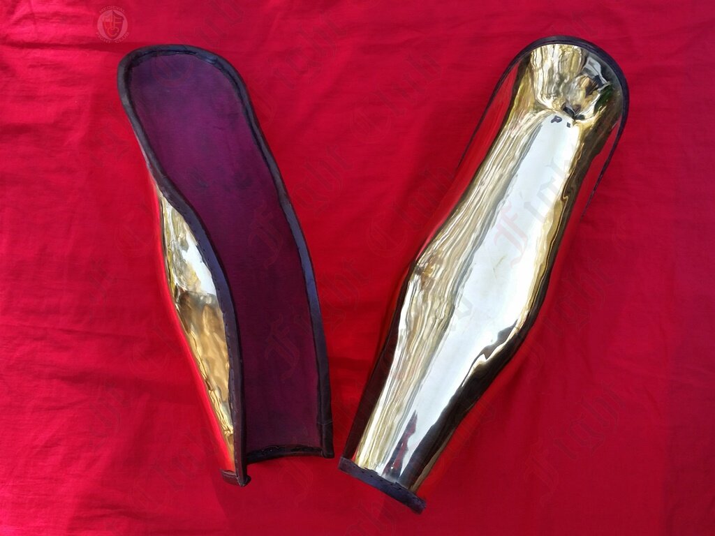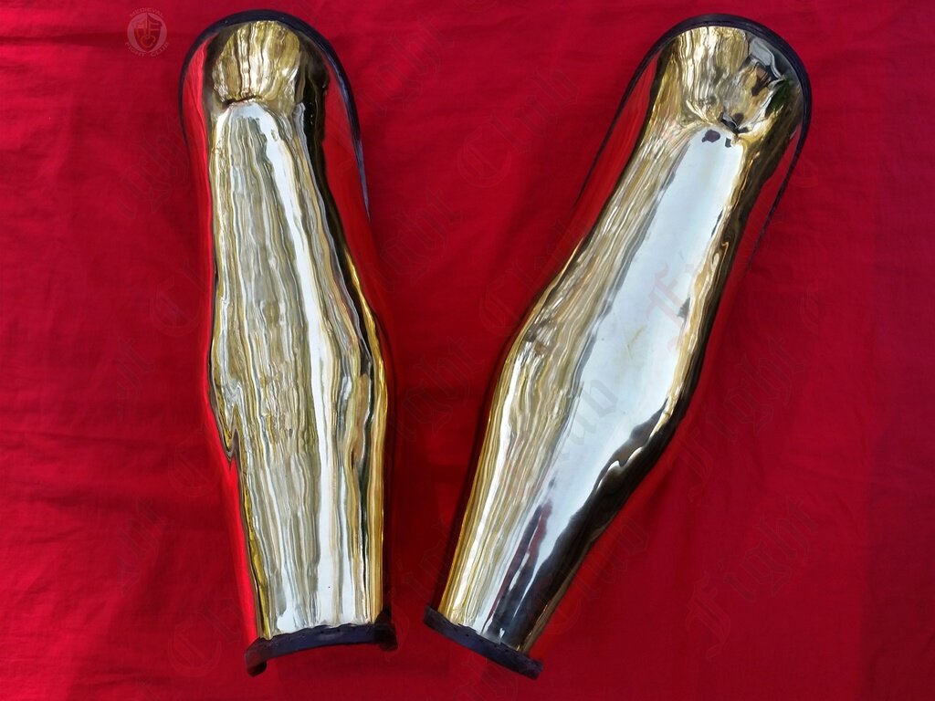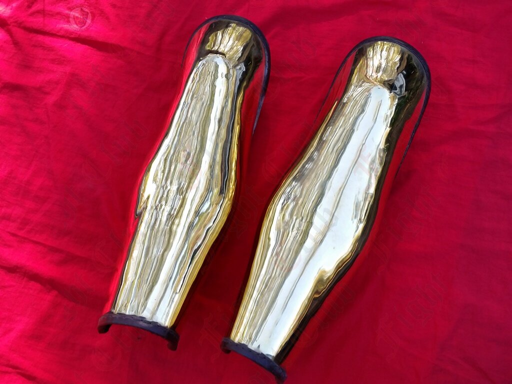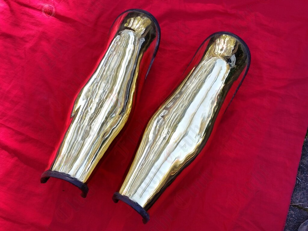 This pair of brass Ancient Greek style leg greaves offer complete leg protection. Extra long and will cover the knees.