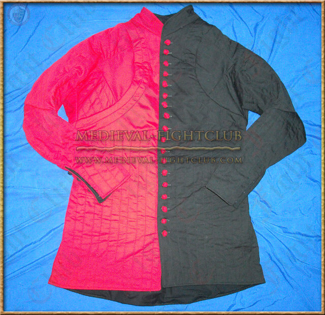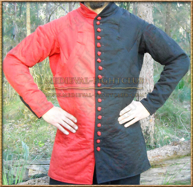 Stylised from the Jupon of Charles VI, late 14th century, and the 15th century's Fiore dei Liberi's - Fior di Battaglia. Featuring Zuparello buttons that can squash flat under armour.A jupon (or fighting cotte) is a fourteenth to fifteenth-century tight-fitting padded garment worn over armor, often displaying family colours or a coat-of-arms.