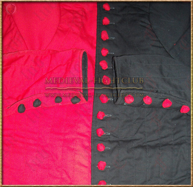 Padded red and black gambeson for use under armour or on its own. Sleeves have been shaped to minimise tugging at shoulders and belt when swinging the arm.