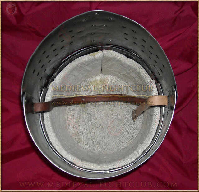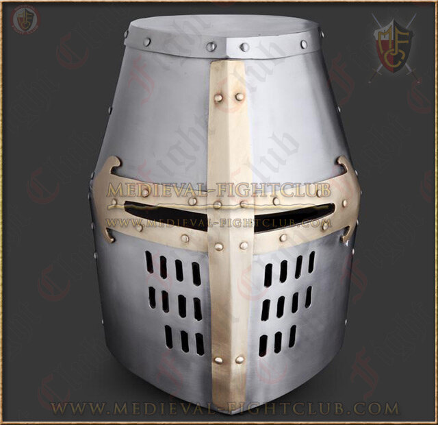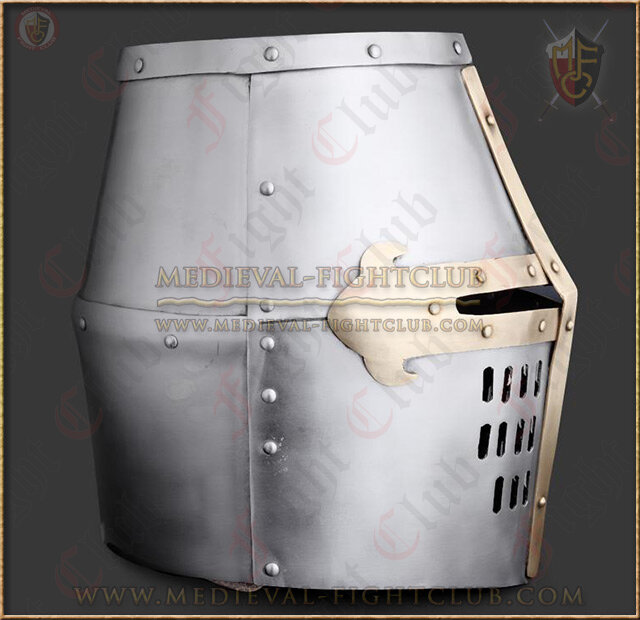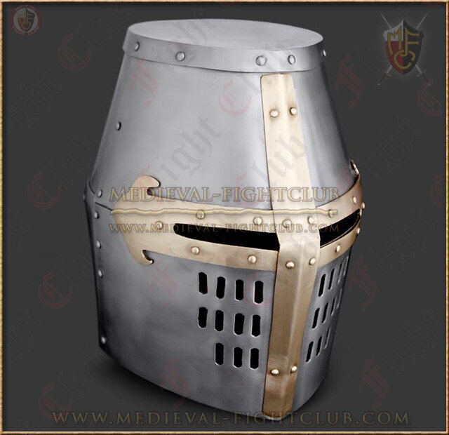 The helm, which began to be seen on the battlefield as early as the 13th century on its earliest forms proved to be a winning design to be used almost for the next three centuries. A simple to manufacture piece whose time tested use proves it was useful even for cavalry protection. Worn commonly over a chainmail coif or skull cap, the Great Helm was usually built with 4 pieces riveted along the seams and with flat top. It has a fierce-looking fixed visor that enhanced the already intimidating look of a charging knight.