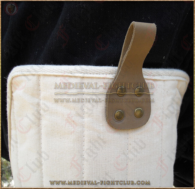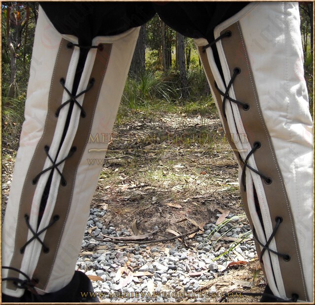 Padded arming legs with adjustable ties at rear, designed to be worn underneath leg armour on a harness or alone.