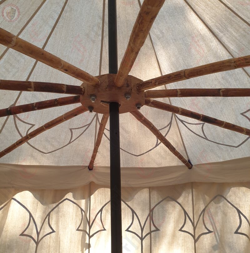 14th Century style painted tent with water repellent heavy duty canvas and spoked wheel hub. No wall poles are required but simple extendable tent poles can be used to add even more stability.