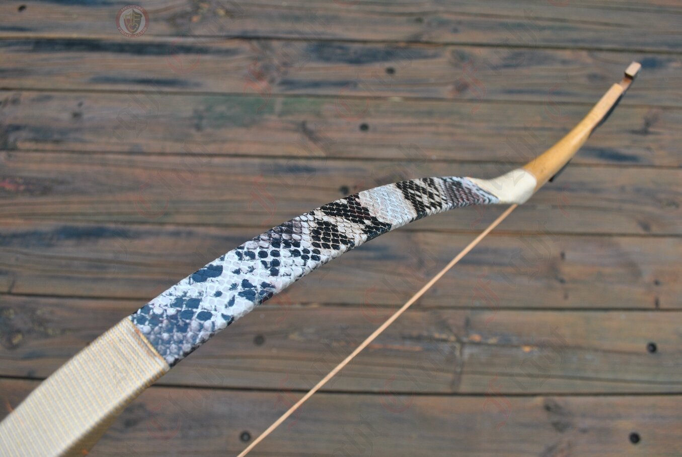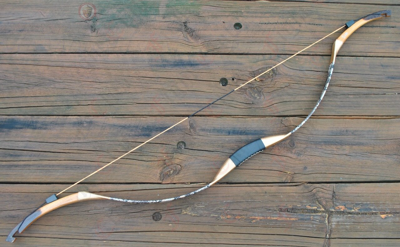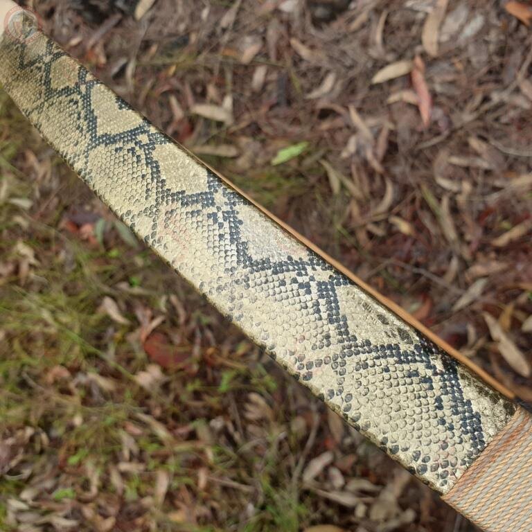 Archery bow with a draw weight of 25(±2) pounds (25#) at 28 inches. Features a gold snakeskin leather wrap.