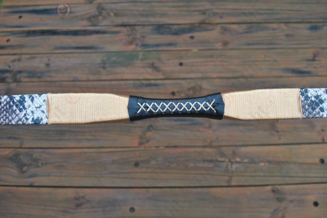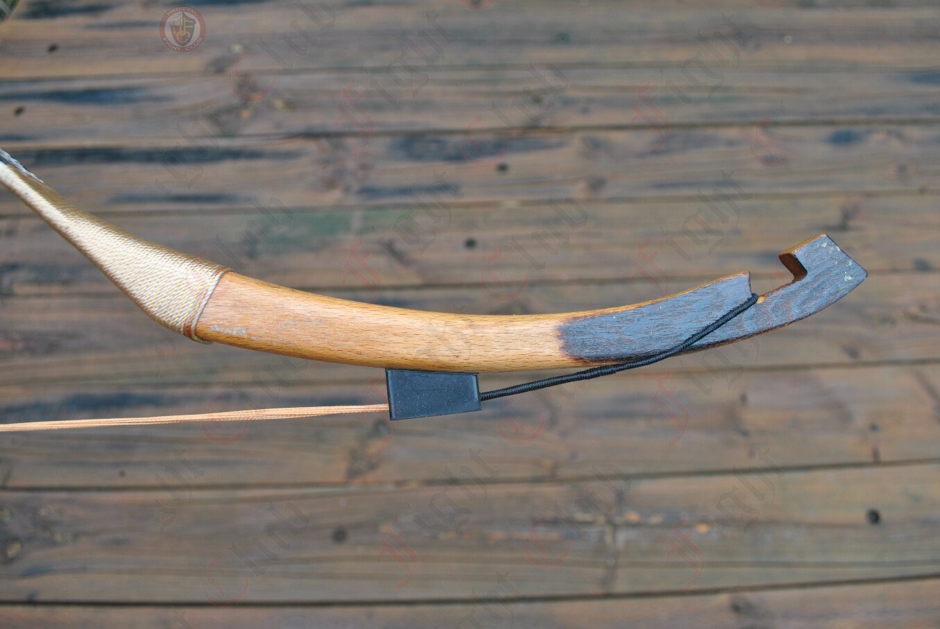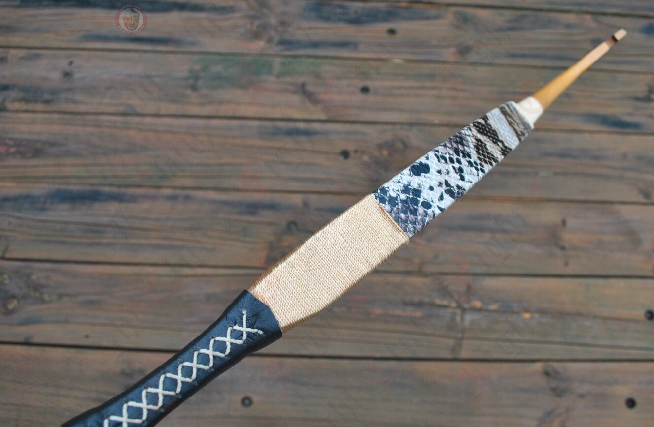 This bow is made from fibreglass and wood. It is wrapped in leather and bound with dacron string.