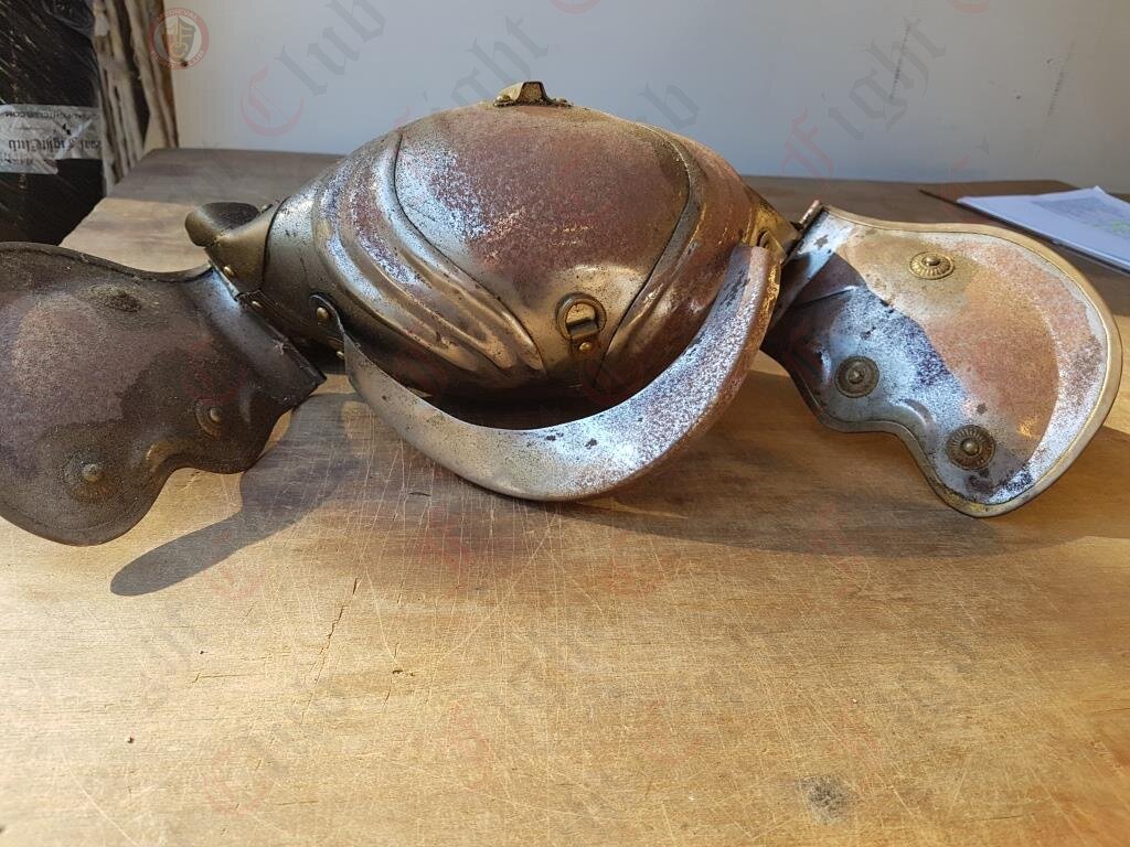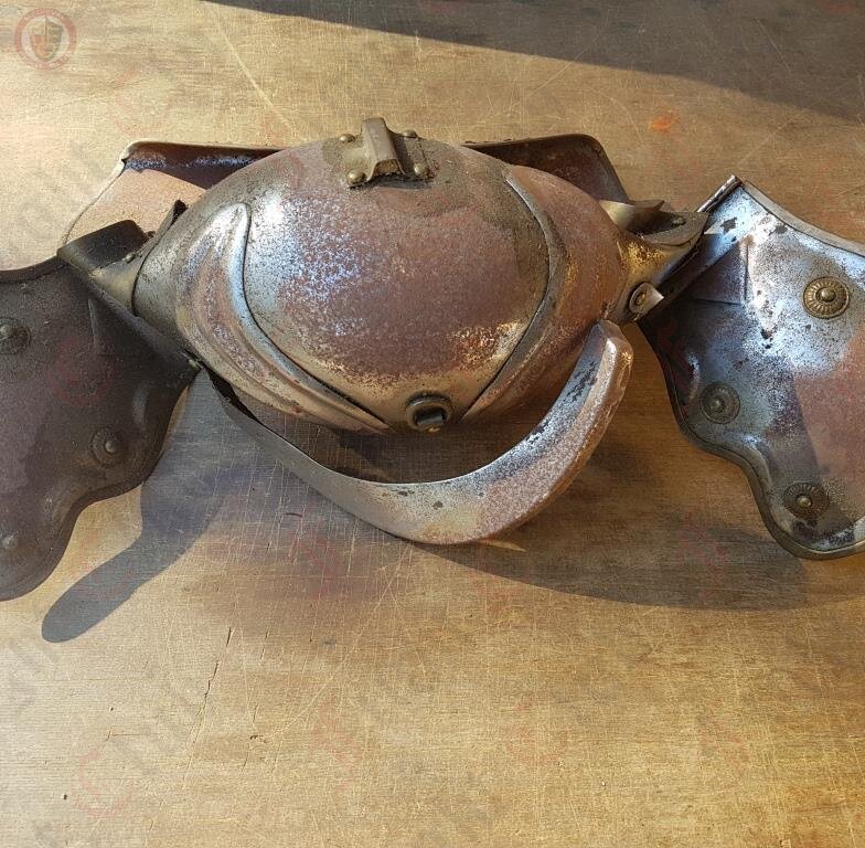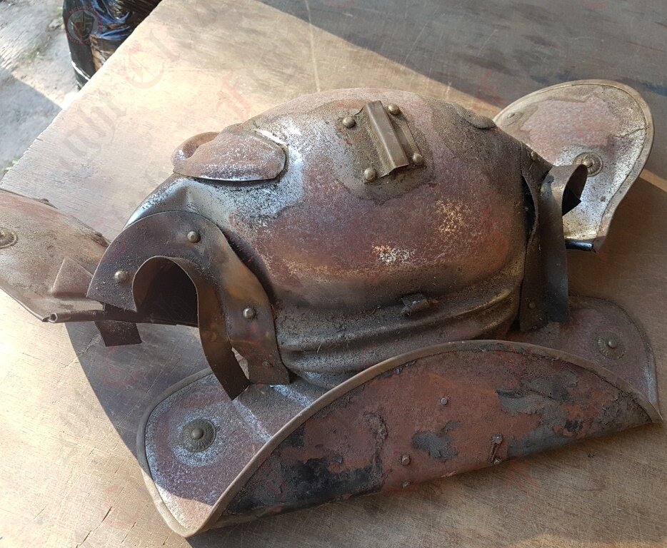 Squashed and rusted Roman Trooper helmet for set dressing.