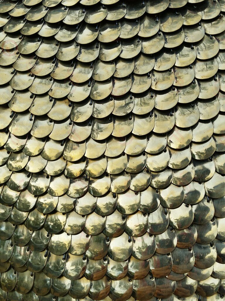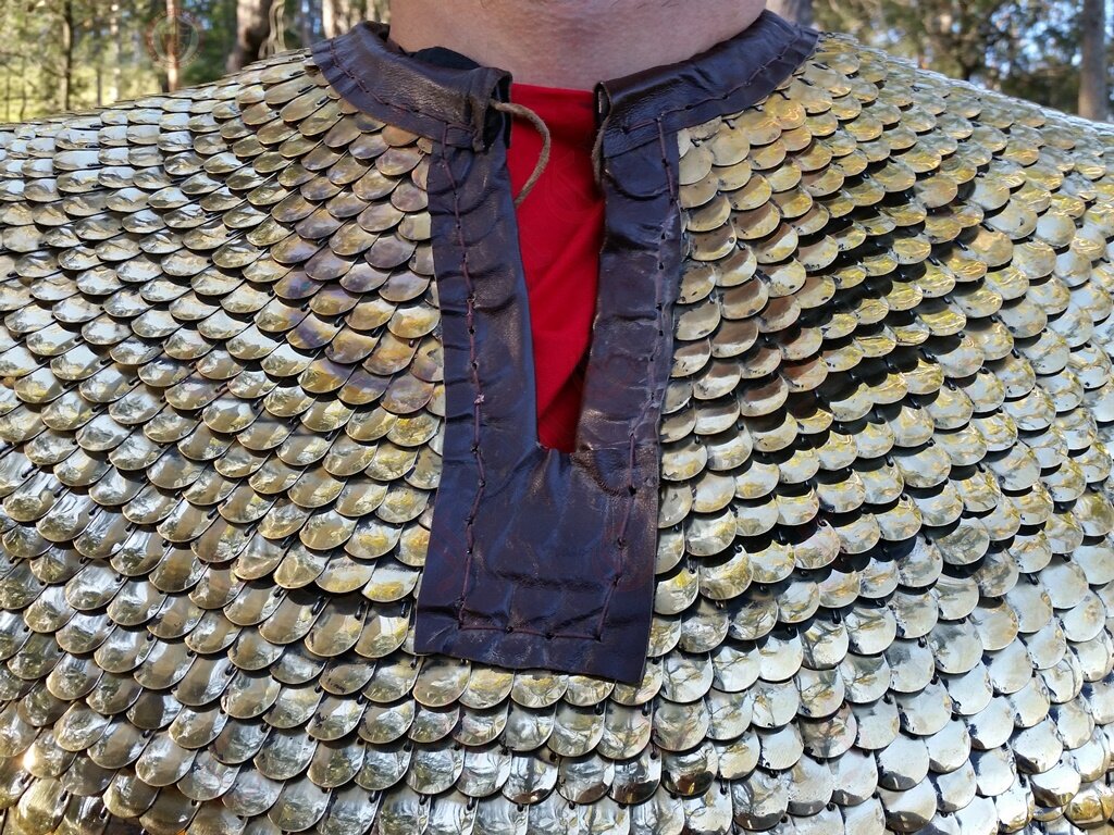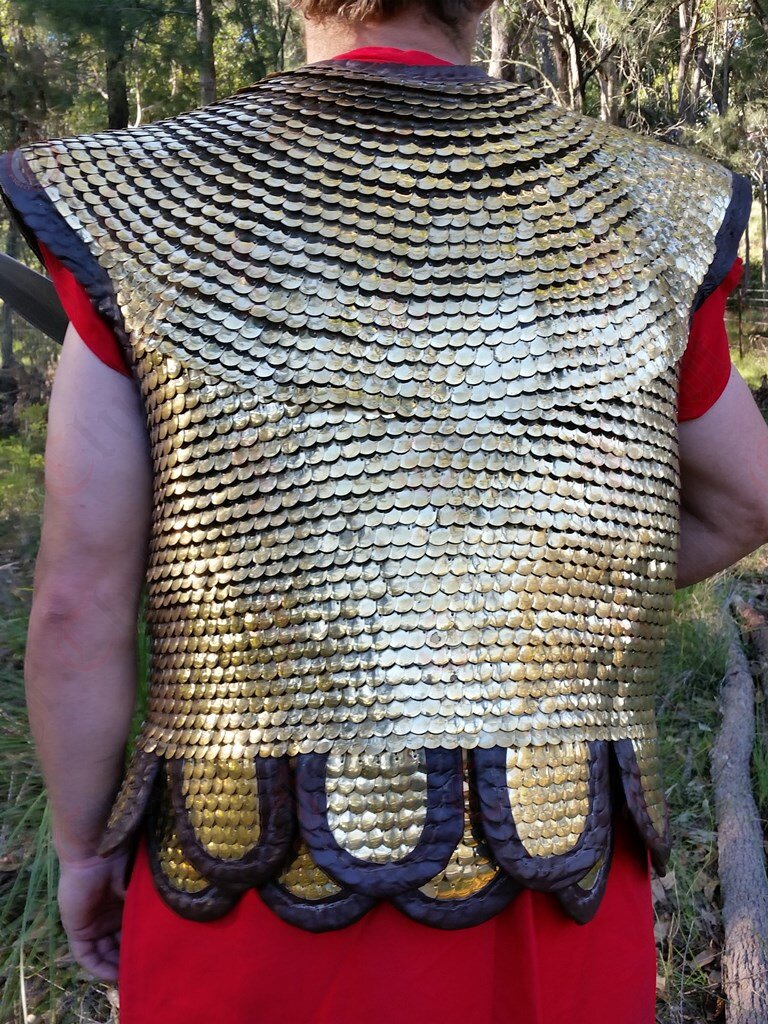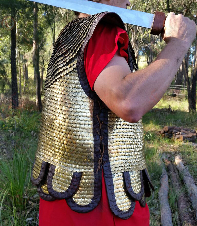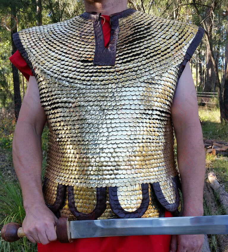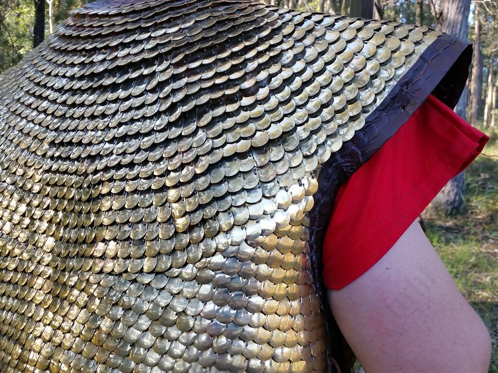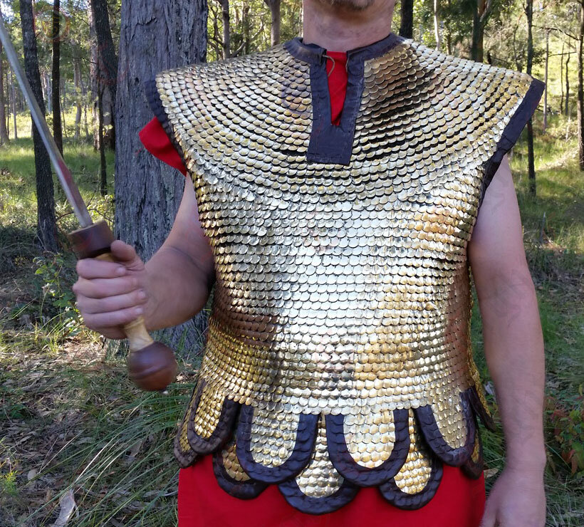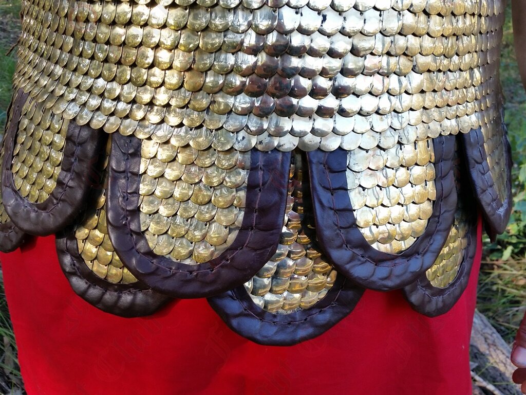 Lorica Squamata is made from lots of tiny brass scales stitched together to form an intricate and comfortable armour. This armour is based on a pattern thought to exist between 1st and 3rd Century.