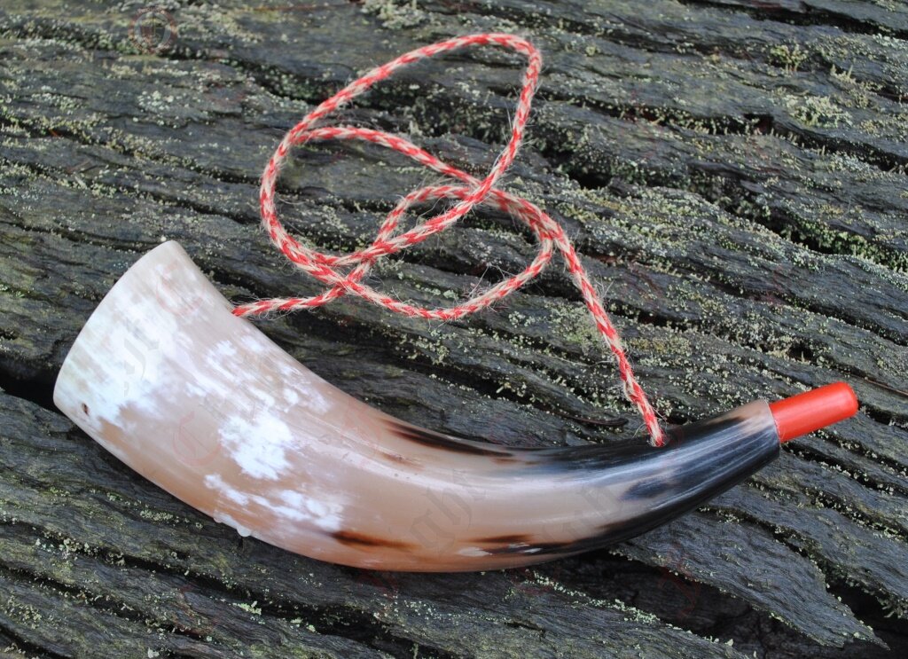 A blowing horn can be used for battle calls over long distances as the shape creates a natural amplification for sound. Like modern trumpets the sound is made from the pressure and rapid vibration of lips.