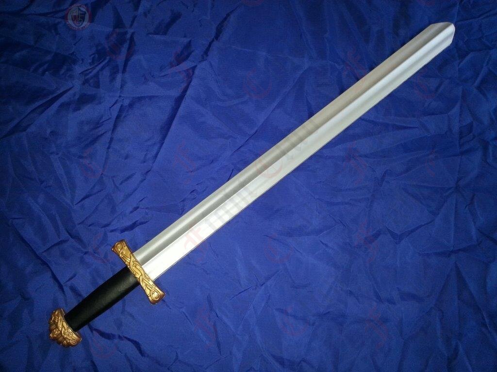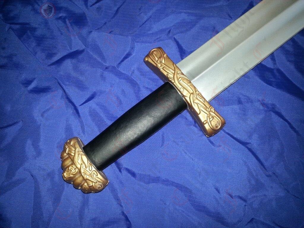 This weapon includes viking patterns inscribed on the gold coloured hilt and pommel. Also this one features a five lobed pommel. These are simple hallmarks of Viking cultures. You too can now play at being Ragnar Lothbrokson.